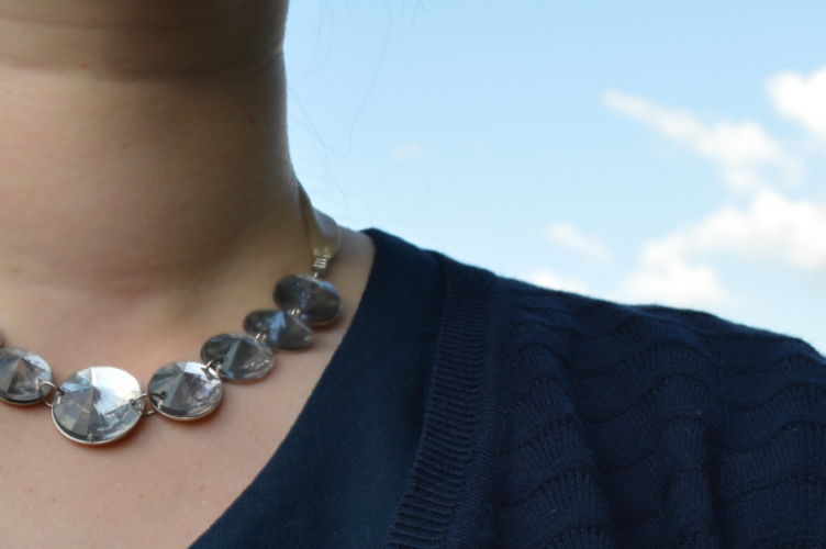 My today´s outfit is a combination of navy blue and white colours. My blue cardigan is offbrand, the white T-shirt from Pimkie has blue Peter Pan style collar and tiny blue bows pattern. I paired these with blue knee length vintage skirt, white leather vintage purse from Bohemian Retro and F&F navy flats. The necklace is also from F&F.